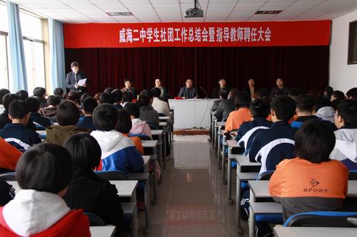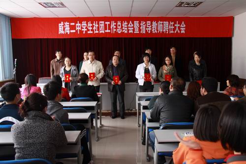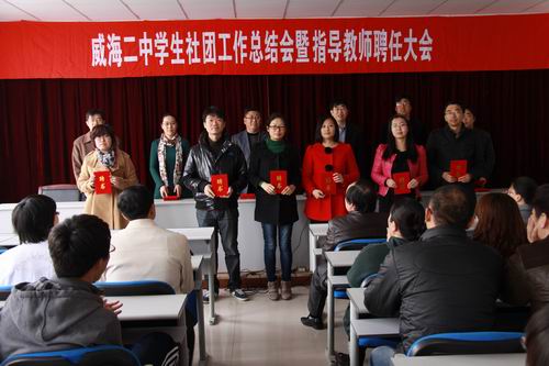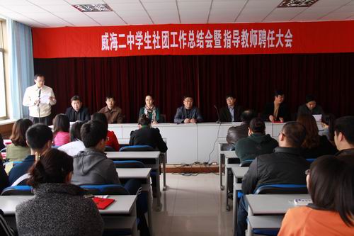 为规范和加快我校学生社团的建设发展,进一步深化对学生社团工作的指导、管理与服务,使其在繁荣校园文化和推进素质教育的进程中发挥更加突出的作用,4月12日,学生工作处在综合楼二楼会议室隆重举行威海二中学生社团工作总结会暨社团指导教师聘任大会。校党委副书记于秀程,副校长谭德欣,学生处副主任许祖涛、孙晓俊,高一级部副主任窦常兴,高二级部副主任谷岩峰,团委书记张华超,各学生社团指导教师、学生社团现任负责人及班级代表共70余人参加了会议。会议由团委书记张华超主持。